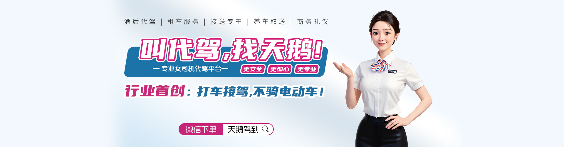 专业提供酒后代驾、商务接送及养车取送等服务。平台优选女性司机,以细致周到的服务,轻松满足您的各类出行需求。